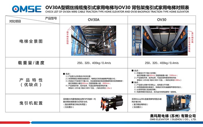 下图为OV30A新一代复合钢丝线缆曳引式家用电梯与OV30背包架曳引式家用电梯在设计结构上以及产品特性上的对照表。